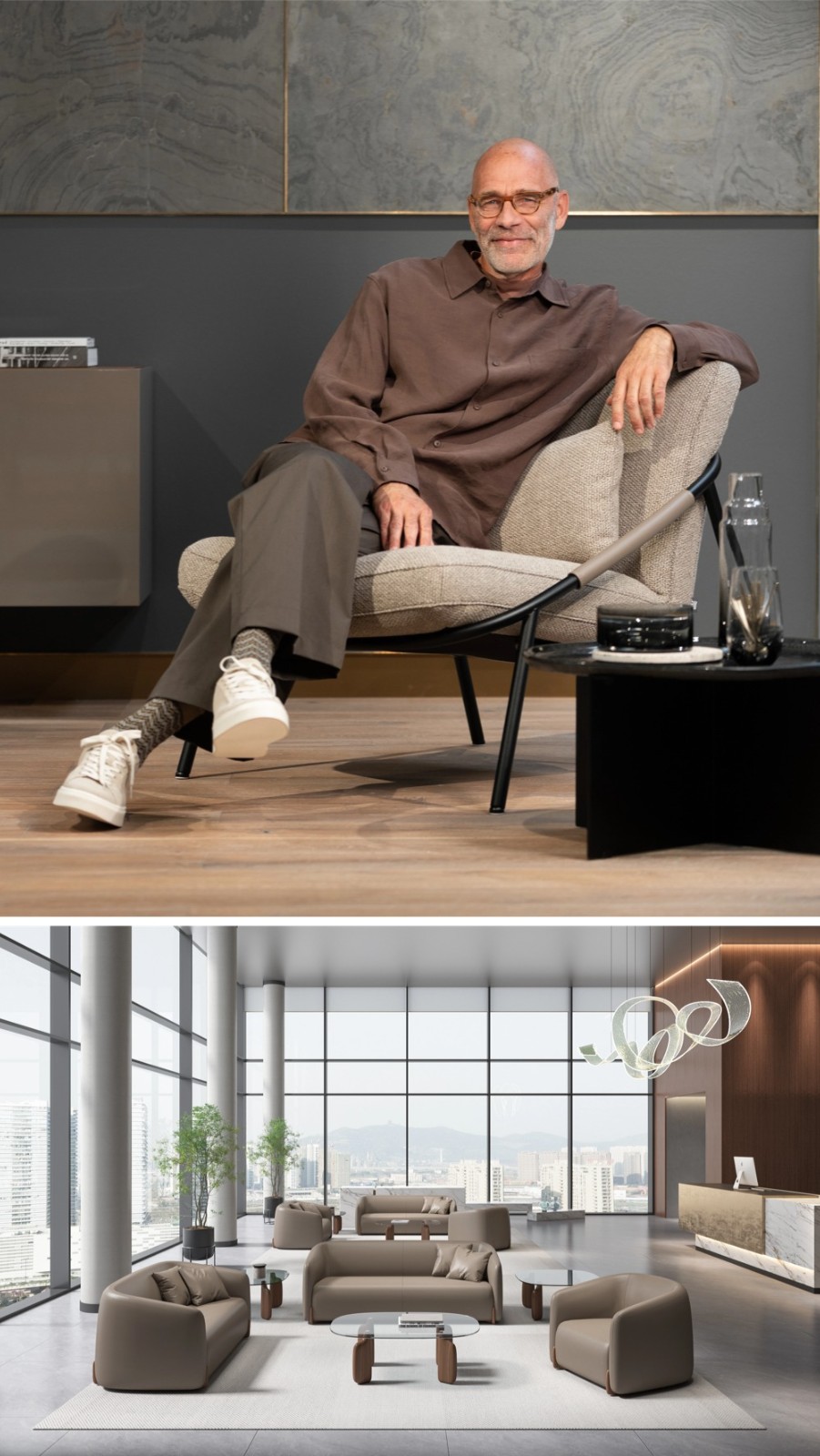 上:国际知名设计师Cuno Frommherz;下:Como沙发灵感来自意大利科莫湖,入座感受如同度假般的轻松自在。